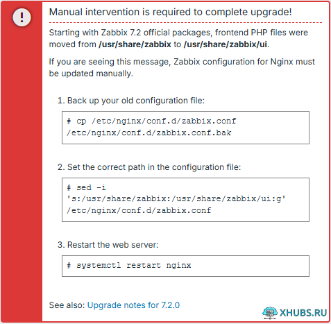 Если вы видите это сообщение, необходимо вручную обновить конфигурацию Zabbix для Nginx. Сделайте резервную копию старого файла конфигурации: